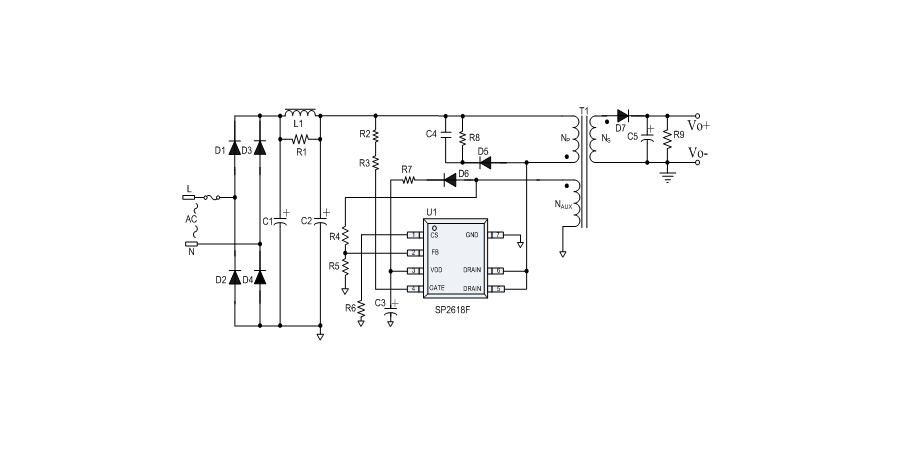 SP2618F是一款性能優(yōu)異的原邊反饋控制電路,應(yīng)用于小功率AC/DC充電器與適配器。控制電路使用原邊采樣技術(shù)進(jìn)行精確的恒流、恒壓控制,可以省去一般應(yīng)用中的光耦與TL431。