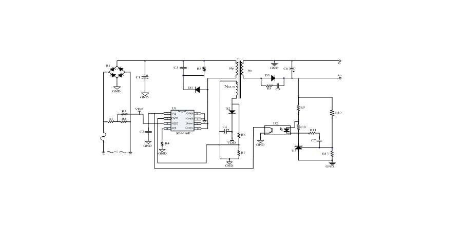 SP6616P是一顆電流模式PWM控制芯片,內(nèi)置650V高壓功率MOSFET,應(yīng)用于功率在13W以內(nèi)的方案。SP6616P在PWM模式下工作于固定開關(guān)頻率,這個頻率是由內(nèi)部精確設(shè)定。在空載或者輕載時,工作頻率由IC內(nèi)部調(diào)整。芯片可以工作在綠色模式,以此來減小輕載時的損耗,提高整機的工作效率。SP6616P在啟動和工作時只需要很小的電流,可以在啟動電路中使用一個很大的電阻,以此來進一步減小待機時的功耗。芯片內(nèi)置有斜坡補償電路,當電路工作于大占空比時,避免次諧波振蕩的發(fā)生,改善系統(tǒng)的穩(wěn)定性。內(nèi)置有前沿消隱時(Leading-edge blanking time),消除緩沖網(wǎng)絡(luò)中的二極管反向恢復電流對電路的影響。SP6616P采用了抖頻技術(shù),能夠有效改善系統(tǒng)的EMI性能。系統(tǒng)的跳頻頻率設(shè)置在音頻(20KHz)以上,在工作時可以避免系統(tǒng)產(chǎn)生噪音。SP6616P內(nèi)置多種保護,包括輸出過壓保護(VOUT OVP),逐周期限流保護(OCP),過載保護(OLP),過壓保護(VDD OVP),VDD過壓箝位,欠壓保護(UVLO),過溫保護(OTP)等,通過內(nèi)部的圖騰柱驅(qū)動結(jié)構(gòu)可以更好的改善系統(tǒng)的EMI特性和開關(guān)的軟啟動控制。