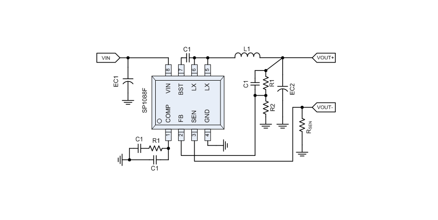 SP1088F適用于有限流要求的DC/DC開關(guān)電源,芯片采用SOP8封裝,僅需較少的外部器件。