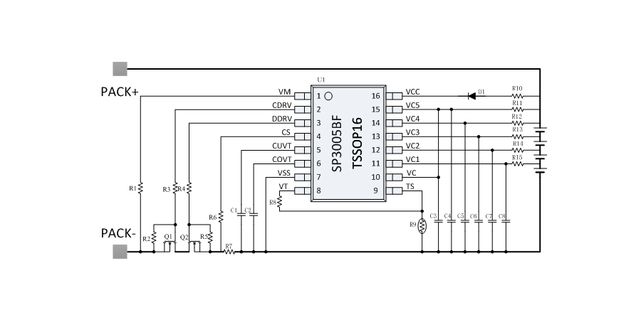 SP3005BF是一款用于5串鋰電池的保護芯片,SP3005BF內(nèi)部集成了高精度的電壓、電流檢測電路,能夠?qū)崿F(xiàn)每串電池的過壓、欠壓保護,以及整串電池的充電過流、放電過流、短路保護和充放電的溫度保護等。SP3005BF內(nèi)部集成N型MOSFET的驅(qū)動電路,能夠直接驅(qū)動外部N型充電管和放電管。