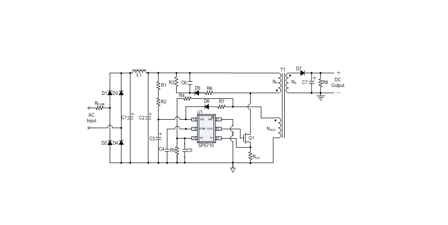 SP5710是一顆高精度離線式開關(guān)電源電路,應(yīng)用于低功耗AC/DC充電器與適配器。SP5710使用原邊取樣來進(jìn)行精確的恒流、恒壓控制,可以省去一般應(yīng)用中的光耦與TL431。
