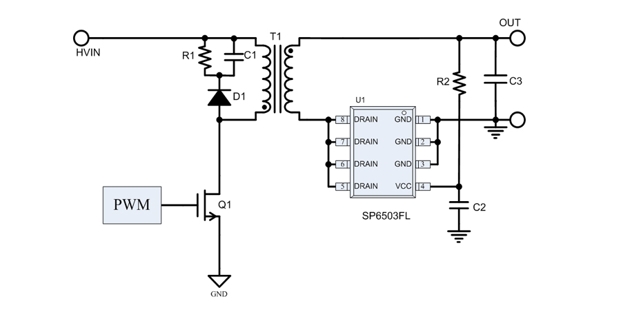 SP6503FL檢測內(nèi)置MOSFET的導(dǎo)通電阻(Rds-on)上的壓降,來控制MOSFET的開關(guān)。應(yīng)用外圍簡單。適用于5V輸出的應(yīng)用方案。